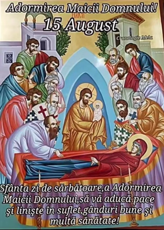 ,,Adormirea Maicii Domnului ,cea mai importantă sărbătoare creștină a verii ,semnifică deopotrivă moartea dar și învierea Sfintei Fecioare Născătoare de Dumnezeu care a fost purtată de ungeri spre împărăția Cerurilor !
