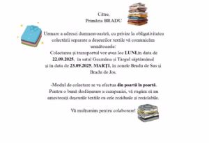 Primăria Bradu anunță desfășurarea unei noi acțiuni de colectare a deșeurilor textile, care se va realiza direct din poartă în poartă, după cum urmează: